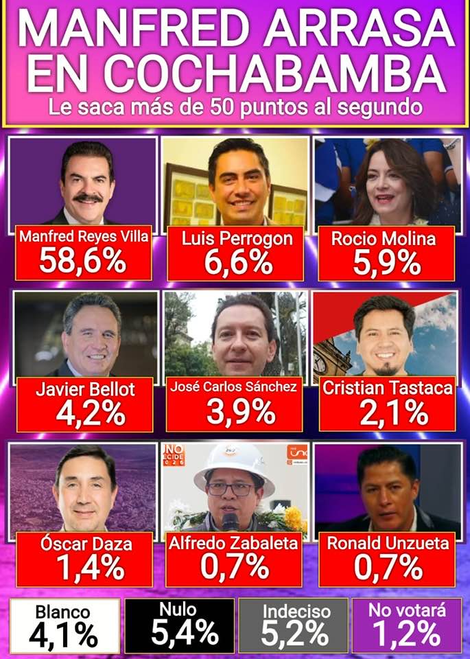 Manfred 58%. El segundo 6%. Manfred arrasa en Cochabamba. A 32 días de las elecciones es el gran favorito.
