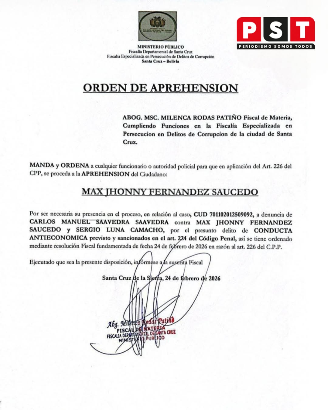La Fiscalía emitió una orden de apremio contra el alcalde de Santa Cruz de la Sierra, Jhonny Fernández, en el marco de la investigación por un presunto caso de pavimento no ejecutado. La medida fue dispuesta luego de que la autoridad municipal acudiera a dependencias policiales para prestar su declaración informativa dentro del proceso que sigue el Ministerio Público.