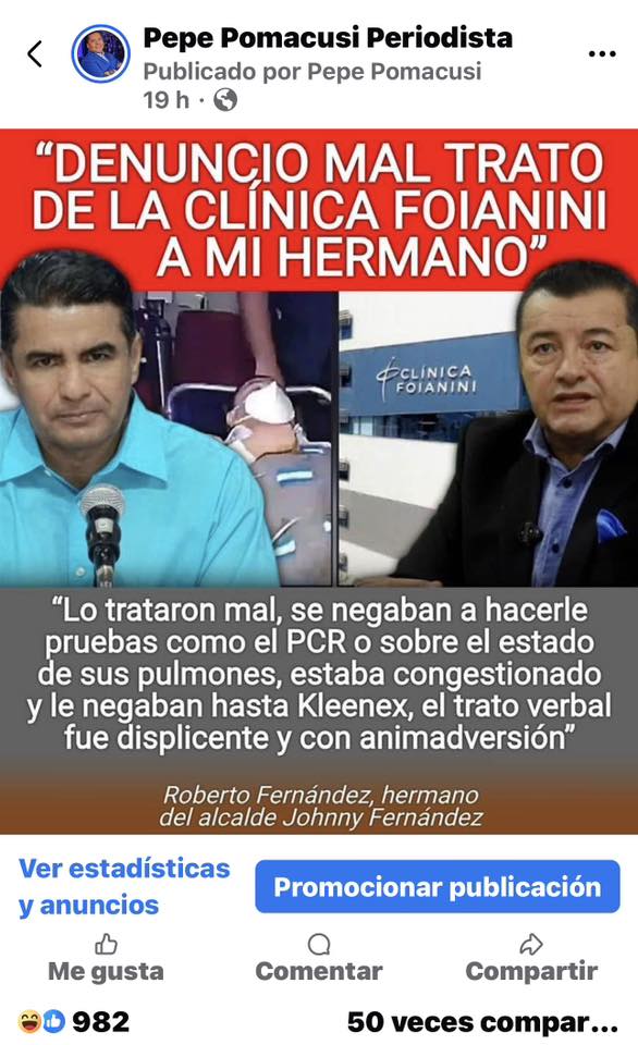 Mañana intentaremos tener la palabra de la Clínica Foianini y del “Dr Menacho”, de emergencias, a quien apuntó de manera directa Roberto Fernández, como responsable de negarle pruebas (hasta “kleenex para su congestionamiento) y trato digno a su hermano.
