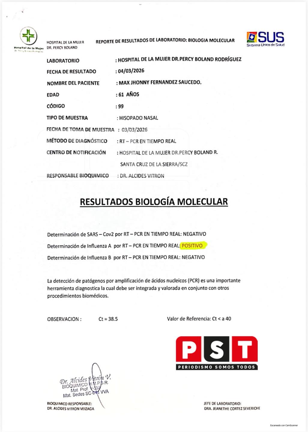 Un reporte médico del Hospital de la Mujer “Dr. Percy Boland Rodríguez” confirmó que el alcalde de Santa Cruz de la Sierra, Jhonny Fernández, dio positivo a Influenza A y negativo a COVID-19 tras una prueba molecular realizada mediante RT-PCR en tiempo real. La muestra de hisopado nasal fue tomada el 3 de marzo y el resultado fue emitido el 4 de marzo por el laboratorio del hospital. Según la información hay varios privados de libertad del PC6 también con síntomas debido a los contagioso de la enfermedad.