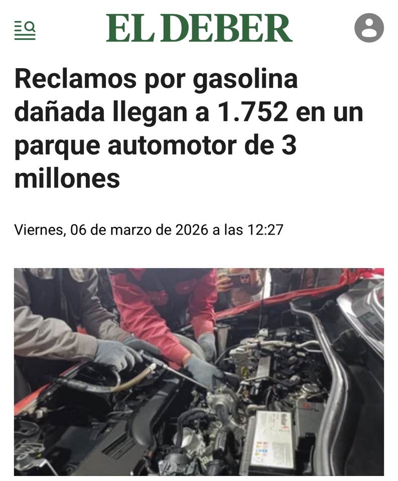 1.700 vehículos dañados por la gasolina. De 3 millones de vehículos que hay en el país. Informe de El Deber.