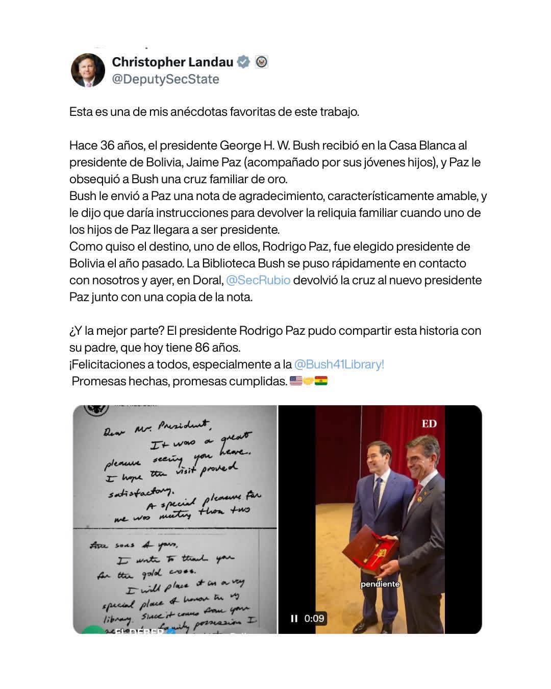 El subsecretario de Estado de Estados Unidos, Christopher Landau, compartió en redes sociales la historia del crucifijo familiar que el expresidente Jaime Paz Zamora entregó a George H. W. Bush hace 36 años durante una visita oficial a la Casa Blanca.
