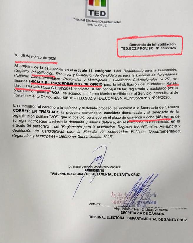 Ayer fue notificado. Ya sabe que se viene su inhabilitación. Ayer la anunció como probable el presidente del Tribunal Departamental de Santa Cruz. El jueves saldrá el fallo.