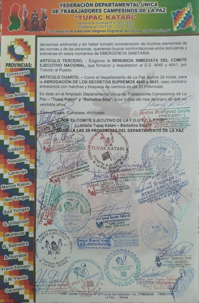 #ANF La Federación Departamental Única de Trabajadores Campesinos de #LaPaz advierte con marchas y bloqueo de caminos si el Gobierno, en un plazo de 24 horas, no abroga los decretos supremos 4640 y 4641, que establece la exigencia de carnet de vacuna o prueba PCR. pic.twitter.com/S6LQ5RFzYX