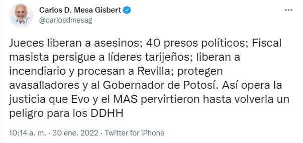 #ANF El expresidente @carlosdmesag, cuestionó el actuar de la justicia boliviana, manipulada por el @BOmereceMAS, que persigue a opositores al Gobierno y protege a quienes incurrieron en irregularidades. https://t.co/DmnCPzDA4C