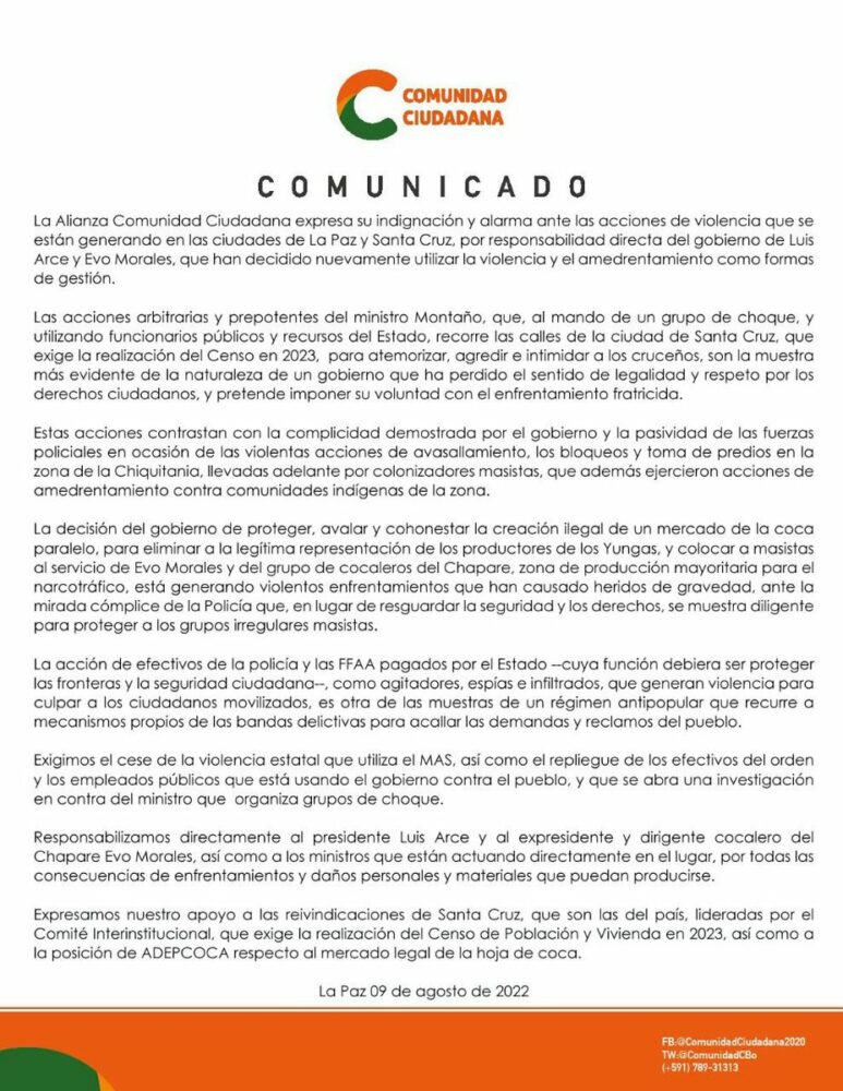 🔵#ANF Comunidad Ciudadana responsabiliza al gobierno de Luis Arce y a Evo Morales por los hechos violentos que se suscitan en #LaPaz y #SantaCruz. También cuestiona al ministro Edgar Montaño por encabezar «un grupo de choque» para «atemorizar, agredir e intimidar a los cruceños» https://t.co/bmAdRgrdaJ