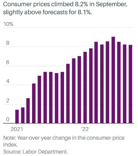 Malas notivias. Hoy salieron los datos de inflación de Estados Unidos: Los precios al consumidor subieron a un ritmo anual del 8,2% en septiembre, marcando una ligera desaceleración desde agosto, pero el IPC subyacente sube más de lo esperado al 6,6%, máximos de 1982. https://t.co/FevKBjMN9U
