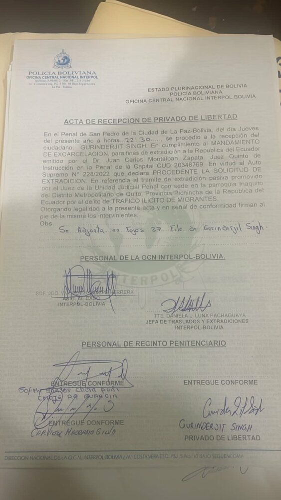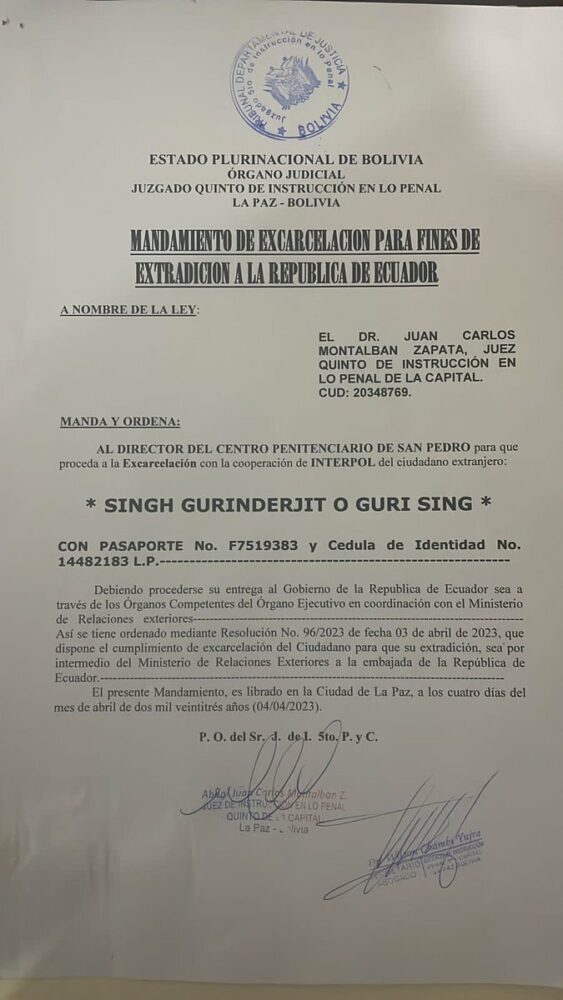 1/2 Se informa al pueblo boliviano que se dio cumplimiento al mandamiento de excarcelación con fines de extradicción a #Ecuador, al señor, Singh Gurinderjit para que responda en su país por el delito de Tráfico Ilícito de Migrantes. https://t.co/tK7nrNfEYw