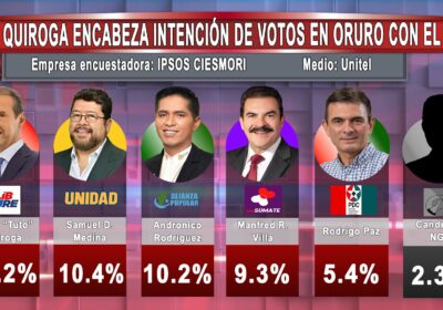 Tuto se impone en Oruro con 18.2%, Doria Medina ocupa el 2do. lugar con 10.4% En Oruro, el candidato presidencial de la… 14/07/2025