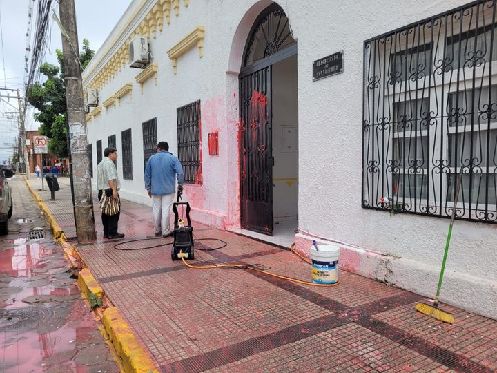 Fachada de Arzobispado en Santa Cruz amaneció pintarrajeada de rojo en protesta contra casos de pederastia 22/05/2023