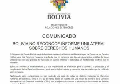 #Bolivia no reconoce informe del Departamento de Estado de #EEUU sobre Derechos Humanos en… 21/03/2023