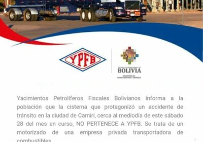 YPFB informa que cisterna que chocó a dos automóviles y a un camión cargado con semillas, pertenece a empresa privada y 28/01/2023