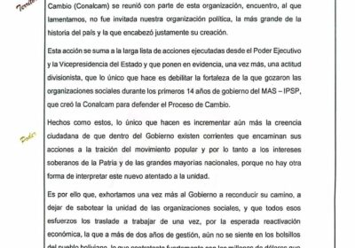 El MAS pide al Presidente Arce «dejar de sabotear la unidad de las organizaciones sociales… 09/01/2023