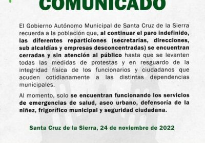 Alcaldía de Santa Cruz comunica que sólo atiende casos de emergencia. La atención al público está suspendida por el paro 24/11/2022