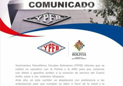 YPFB informa que suministrará combustibles a una sola estación de servicio del cuarto anillo para ambulancias, bomberos y vehículos de emergencia 29/10/2022