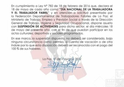 Ministerio de Trabajo dispone asueto con suspensión de actividades para trabajadores fabriles este 18 de mayo 17/05/2022