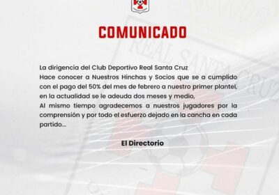 Comunicado de la dirigencia de #RealSantaCruz se cumplió con el pago del 50% de sueldo del… 18/05/2022