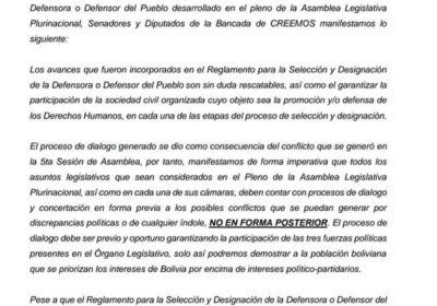 Creemos denuncia que reglamento para selección del Defensor del Pueblo no fue aprobado por unanimidad 15/03/2022