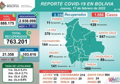 Reporte: 2.358 pacientes se recuperaron de COVID-19 este jueves y 1.086 dieron resultado positivo 17/02/2022
