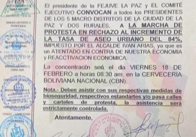 #LaPaz: Fejuve convoca a marcha «en rechazo al incremento de la tasa de aseo urbano del 84… 17/02/2022