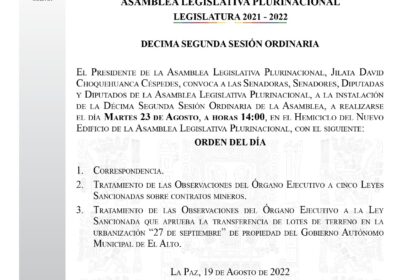 Vicepresidente convoca a sesión de la Asamblea para analizar las observaciones del Ejecutivo a seis leyes 19/08/2022