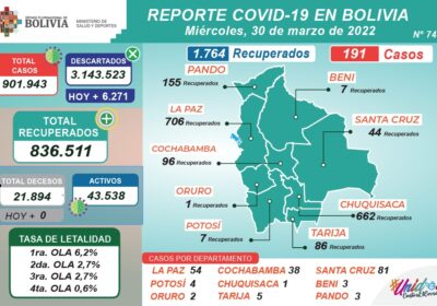 Salud informa que este miércoles 1.764 personas vencieron al COVID-19 y 191 adquirieron el virus 30/03/2022