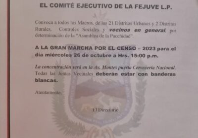#LaPaz también pide Censo ya! #FEJUVELaPaz anuncia marcha por el #Censo2023 para el 26 de… 25/10/2022