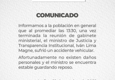 El ministro de Justicia, Iván Lima, sufrió un accidente vehicular A través de un comunica… 12/10/2022