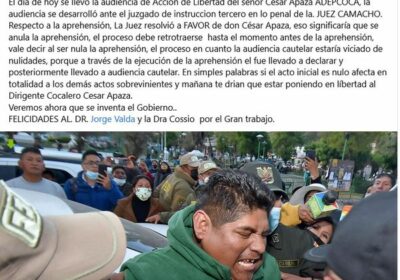 «Mañana tendrían que estar poniendo en libertad al dirigente cocalero, César Apaza», dice … 26/09/2022