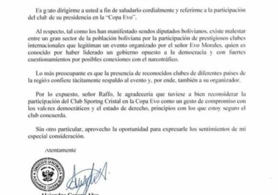 Congresista de Perú pide al Club Sporting Cristal no participar en la Copa Evo El Congres… 11/07/2022