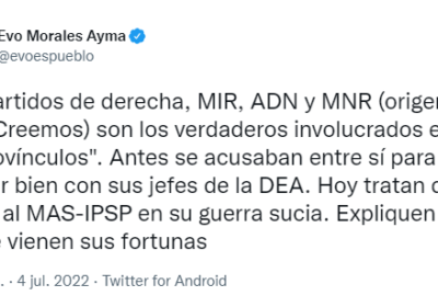 | El expresidente y líder del MAS Evo Morales dice que «los partidos de de…