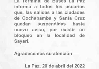 #Ultimo | La terminal de buses de #LaPaz anuncia que las salidas a #Cochabamba …
