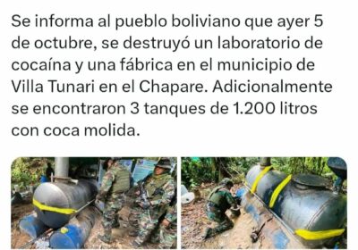 Ministro de gobierno informa que se destruyó un laboratorio de cristalización de cocaína en el Chapare 07/10/2023