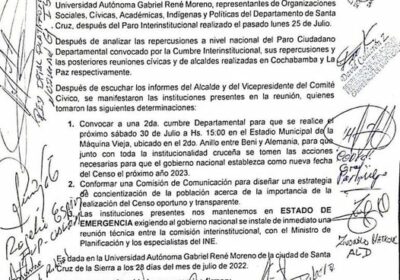 Plantean Cumbre Interinstitucional en Santa Cruz con participación de todo el departamento 28/07/2022