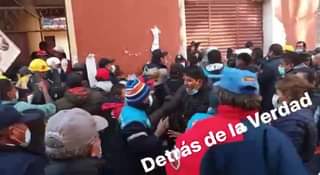 En puertas de la Confederación Sindical de Trabajadores en Construcción de Bolivia pelean para ingresar al ampliado. 24/03/2022