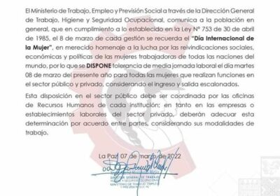 Trabajo decide tolerancia de media jornada para este martes por ser día internacional de la mujer 07/03/2022