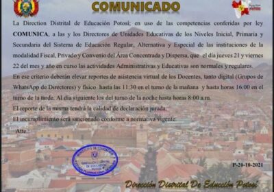 Dirección de Educación en Potosi informa que actividades serán normales este jueves y viernes 20/10/2021