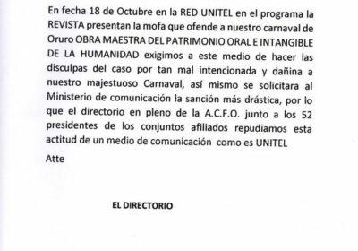 Asociación de Conjuntos Folcklóricos de Oruro exige disculpas públicas de un medio de comunicación 19/10/2021