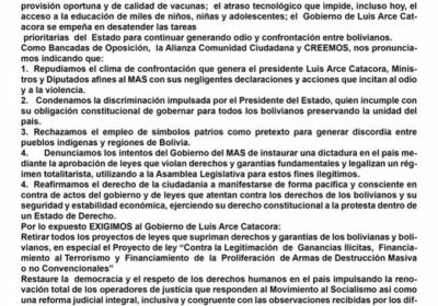 Comunidad Ciudadana y Creemos cuestionan trabajo del presidente Arce y exigen que termine persecución 14/10/2021