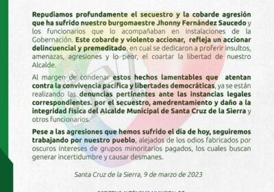Municipio cruceño emite Comunicado oficial de rechazo a las agresiones contra el alcalde Fernández 09/03/2023
