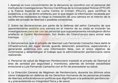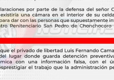 Dirección General de Régimen Penitenciario, emite comunicado por denuncia del gobernador Luis Fernando Camacho de «Cámar 27/01/2023