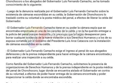 Comunicado de la familia del gobernador Luis Fernando Camacho, tras denuncia realizada por el Gobernador sobre la existe 27/01/2023