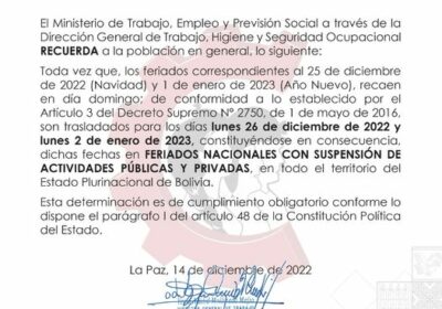 Ministerio de Trabajo confirma que feriados del 25 de diciembre y 1 de enero de 2023 pasan… 14/12/2022