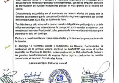 El MAS-IPSP denunció que «los nuevos aliados de la megacoalición difunden una campaña de mentiras y desinformación» para boicotear la concentración del 18 de diciembre en Sacaba, # 14/12/2022