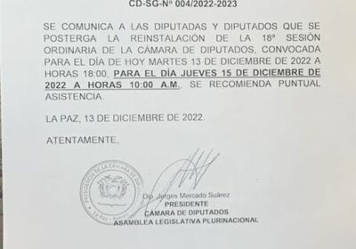 Cámara de Diputados posterga para el 15 de diciembre la reinstalación de sesión para trata… 14/12/2022