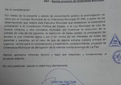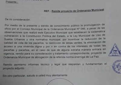 Alcalde Iván Arias remite el proyecto de Ordenanza Municipal de abrogación de la Ordenanza Municipal No. 046 de construcciones irrestrictas al Concejo Municipal De La Paz. 12/12/2022