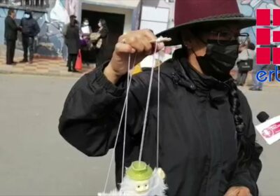 La activista alteña Guadalupe Daza muestra una marioneta con la imagen del vicem…