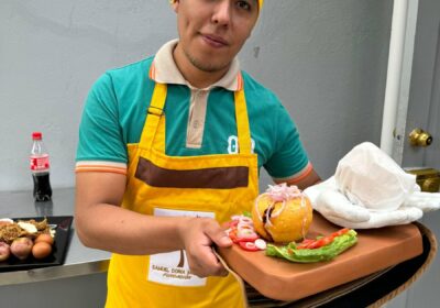Aldo muestra las papas rellenas que preparó para los jurados del Emprende Ideas….