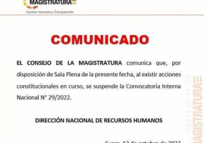 #Sucre: Consejo de la Magistratura, dejó sin efecto la convocatoria nacional N 29/2022. La misma que fue observada por varios jueces transitorios quienes pidieron su nulidad. Sala 12/10/2022