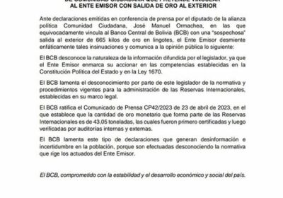 #Banco Central de Bolivia: Desmiente declaraciones del Dip. de C.C. Manuel Ormachea que pretende vincular al ente emisor con salida de oro al exterior. 02/05/2023